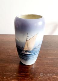 Questo vaso si intitola “Barca a vela in Guldborgsund” ed è identificato dal codice “2609”. A garanzia di autenticità il vaso reca il marchio della Royal Copenhagen, la Corona sopra le tre Linee Ondulate, e le iniziali del pittore.
