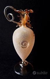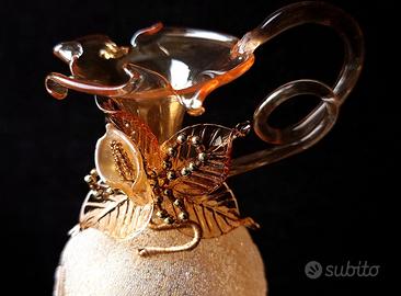 La caratteristica principale di questo pezzo è il bouquet di fiori in vetro tridimensionale, realizzato separatamente e accuratamente unito al corpo del vaso. Questo dettaglio fa sì che il pezzo assomigli non solo a un vaso, ma a una piccola scultura decorativa in vetro.