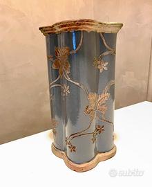 Bel vaso smaltato in ceramica con decori di fiori e foglie color grigio chiaro su sfondo azzurro polvere, ideale per decorare un tavolino, una scrivania, ma anche per abbellire la vetrina di un negozio.