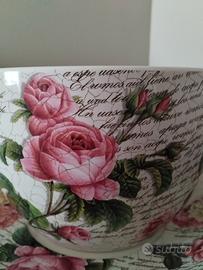 Vaso/portavaso shabby in ceramica a forma di tazza con sottopiatto. Il vaso ha foro di scolo. Diam vaso cm 22, diam piatto cm 28, altezza cm 16.