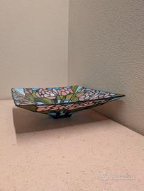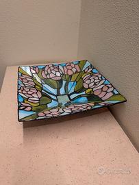 vaso 25.5 x25.5 cm in mosaico con vetri tagliati a mano e saldati a stagno, con un motivo decorativo di fiori rosa (probabilmente peonie o loto) su sfondo azzurro.