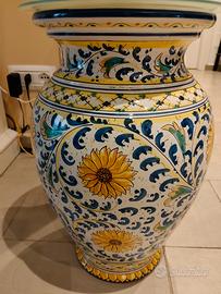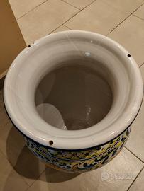 vaso in ceramica di Caltagirone originale con piano di vetro satinato con funzione di appoggio ( tavolino) o usabile come portaombrelli. Lieve sbeccatura sul bordo inferiore come da foto