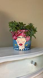 Vaso in terracotta dipinto a mano, volto di donna. Può essere usato come arredo da solo oppure con pianta. Diam 15 Idea regalo
