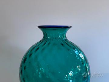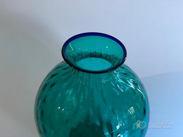 Vaso Venini in perfetto stato Anno 2002 Modello: Balloton Colore: Verde Paraiba con bordo blu Altezza: 16,5 cm Diametro: 14 cm Peso: 0,450 Kg Collezione: Icone Balloton Designer: Venini Spedizione professionale Il Vaso Monofiore Balloton disegnato nel 1970 è realizzato in Vetro soffiato e lavorato a mano, con la tradizionale tecnica della lavorazione a Balloton, con filo riportato a caldo sulla parte superiore dell’oggetto. BALLOTON: Tecnica usata per ottenere un particolare effetto ottico. Si basa sull’uso di uno stampo in metallo con all’interno delle punte a piccola piramide a base quadrata che, durante la soffiatura, conferiscono all’oggetto un effetto a rilievo incrociato.