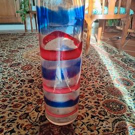 Elegante vaso Venini in vetro, con un design unico e vibrante. I Venini sono oggetti di design in vetro artistico prodotti dalla storica azienda Venini, una delle realtà più importanti al mondo nel campo del vetro di Murano. - Decorazione a spirale con colori vivaci. - Forma cilindrica slanciata.