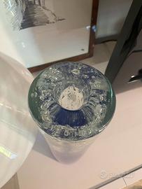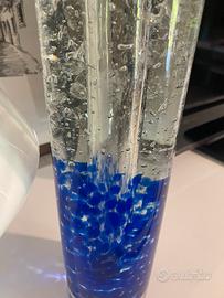 "sommerso". Il "sommerso" è una forma d'arte del vetro di Murano che presenta strati di colori contrastanti (solitamente due), la tecnica prevede l'immersione di un soffiato spesso nel crogiolo contenente vetro trasparente di un altro colore e di spessore altrettanto grande. Nello specifico, questo vaso a fiore singolo è nei toni di un blu, con una struttura trasparente.