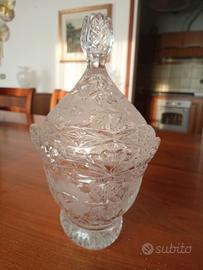 Vaso in vetro decorato con coperchio altezza 26 cm e larghezza 20 cm.