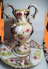 Questo affascinante set, composto da un vaso con manici e un piatto abbinato, è un pezzo decorativo unico. Entrambi i pezzi sono caratterizzati da una base bianca decorata con vivaci motivi floreali rosa e verdi, e impreziositi da dettagli dorati. La texture ruvida e spugnosa verde e bianca aggiunge un tocco di originalità. Il vaso, con le sue linee sinuose, si poggia perfettamente sul piatto decorato, creando un insieme armonioso e di grande impatto visivo. Un'ottima aggiunta per chi cerca un pezzo d'arredo vintage e raffinato.