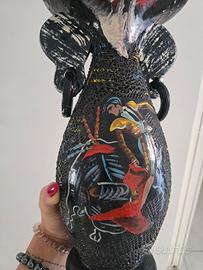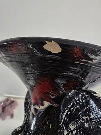 * stile inconfondibile: il corpo del vaso presenta una particolare texture "a nido d'ape" o vulcanica in nero lucido, impreziosita da schizzi di colore giallo e azzurro.