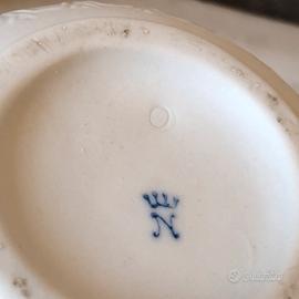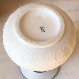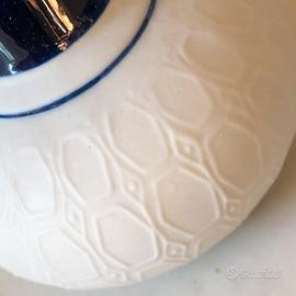 Piccolo ed elegante vaso, originale degli anni ‘60, da collezione, in stile Space, in porcellana decorata, da collezione; superficie in parte bianca satinata, con decoro geometrico a motivi esagonali a rilievo, in parte lucida, smaltata di blu. Presente il marchio di fabbrica sul fondo: stampo in blu raffigurante una N con la corona (Manifattura italiana di Capodimonte?), impressa inoltre la lettera “O” maiuscola. Dimensioni max cm ~ : Ø max 9 Ø apertura 3 int / 6 est H 11.2 Peso 200 g ~ Condizioni: il vaso è integro (non presenta sbeccature, “filature”, riparazioni), in ottimo stato di conservazione, non si notano rimarchevoli segni di usura, se non zone ingrigite per il deposito della polvere nella superficie della porcellana satinata e sul bordo del fondo (zone di contatto con il piano di appoggio), sporcizia e resti di calcare all’interno del vaso; si notano minimali e sporadici difetti di produzione (piccole imperfezioni quali inclusioni scure o irregolarità del piano e/o bordo della superficie del manufatto) - vedi ultime foto di dettaglio - LE FOTO SONO PARTE INTEGRANTE DELLA DESCRIZIONE Nota: potrebbe esserci delle leggere divergenze tra il colore reale dell’oggetto quello che risulta dallo schermo degli apparecchi con i quali viene visualizzata la foto. =================== Dai un’occhiata ai miei altri annunci, troverai molte altre offerte di articoli vintage, in particolare un posacenere in porcellana dello stesso stile e manifattura. RITIRO A MANO ROMA - TRASTEVERE