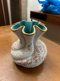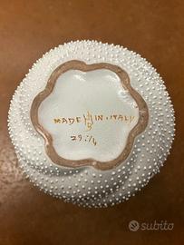 Presenta una finitura bianca a pois in rilievo, un interno turchese e bordi dorati.