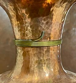 vaso martellato in rame patinato con bordo ondulato e finitura in ottone sul collo, risalente alla metà del XX secolo. Alto 24 cm diametro massimo 14 cm. Prodotto da Battaglia a Menaggio