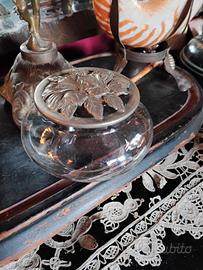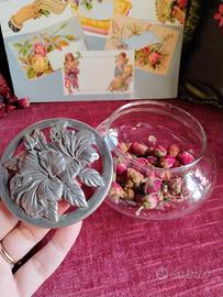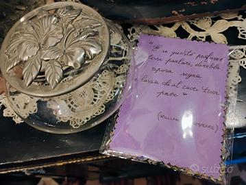 Vaso vintage anni '80 per pot-pourri in vetro lavorato a mano, con coperchio in metallo finemente decorato. Incluso anche il sacchettino di lavanda (come visibile in foto), con frase poetica di William Shakespeare : " E se questo profumo potesse parlare, direbbe: riposa sogna e lascia che il cuore trovi pace" Se posizionato sul comodino, la lavanda, con la sua essenza naturalmente rilassante, accompagna il sonno e rende l’atmosfera più calma e accogliente La parte superiore presenta un motivo floreale traforato raffigurante fiori di ibisco: non solo decorazione, ma un disegno aperto che lascia respirare le fragranze e le diffonde con delicatezza nell’ambiente. Simbologia Ibisco Nella sua simbologia più antica, parla di bellezza fugace: il suo fiore dura poco, spesso solo un giorno. E proprio per questo insegna qualcosa di essenziale, che la bellezza non si possiede, si attraversa. È un invito gentile a vivere il presente, senza rimandare. Poi c’è la femminilità, ma non quella ostentata. Una femminilità morbida, naturale, quasi spontanea. l’ibisco è anche simbolo di ospitalità e benvenuto. Non a caso lo si trova spesso vicino alle case, indica bellezza e pace. Il vetro è luminoso e autentico, presenta una piccola bolla, tipica delle lavorazioni artigianali, segno concreto di un oggetto fatto a mano e non prodotto in serie. Per arredare con un tocco romantico e vintage creare un angolo profumato e rilassante un regalo elegante e ricco di significato. Eccellenti condizioni vintage, presenti lievi segni del tempo sul bordino del metallo Spedizione accurata e veloce SCONSIGLIO Poste Italiane 🚫