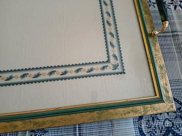 Vendo vassoio in cornice. Misure: larghezza 55 altezza 40. Ricamato a mano p .croce su tela lino cornice con manici in metallo verde e legno di pregio. Solo se interessati veramente. No perditempo. Il mio numero è: 3293714014 (Annalia)