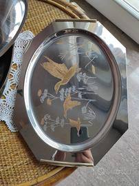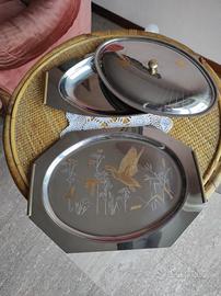 Vendo vassoi da portata in acciaio con inserti in oro. Uno ha il coperchio