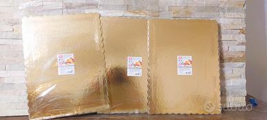Causa cambio progetto vendo a euro 50,00 TRATTABILI tre vassoi in cartone dorato e tre scatole porta torta misure 31 cm × 42 cm, e sei vassoi in cartone dorato con centrini in carta di pizzo misure 28 cm × 20 cm.
