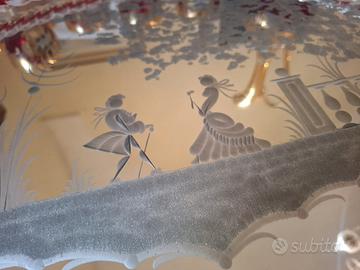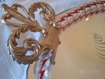 Vassoio a specchio in vetro di murano spesso attribuito allo stile di Ercole Barovier o Barovier & Toso. Presenta una base a specchio ovale decorata con una incisione di una scena galante o romantica in stile veneziano. Il bordo è rifinito con un cordone di vetro ritorto rosso e bianco. Le maniglie sono in metallo dorato lavorato
