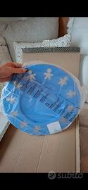 Vendo iconico vassoio rotondo della serie "Girotondo" di Alessi, disegnato dal duo King-Kong (Stefano Giovannoni e Guido Venturini). L'oggetto è un vero pezzo di storia del design italiano, caratterizzato dal celebre bordo traforato con il motivo degli"omini". Questa versione in acciaio colorato blu (resina epossidica) è una variante cromatica molto ricercata e meno comune rispetto alla classica versione silver. Include la scatola originale Alessi, nuovo mai usato, ancora nel cellophane. Diametro ca 40 cm. Materiale: accaio colorato con resina epossidica Made in Italy