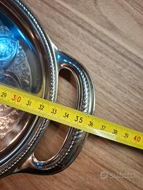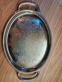 Vassoio ovale in metallo argentato Alessi vintage con manici e un motivo floreale arabesco inciso. Bellissimo!