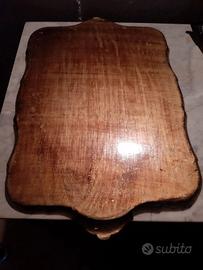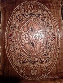 Vassoio in plastica con effetto legno e decorazione centrale intarsiato.