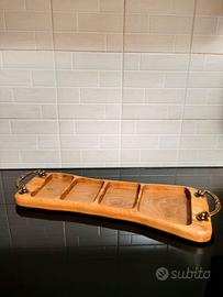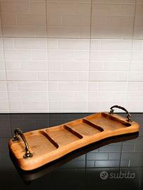 Splendido vassoio per aperitivo/snack/antipasti, realizzato interamente a mano in legno di ulivo, pezzo unico e senza colla o giunzioni. Dall'aspetto rustico e con maniglie in metallo mobili e orientabili stile vintage, finitura liscia con pura cera d'api biologica adatta al contatto alimentare.
