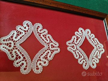 Il vassoio è realizzato interamente a mano, compresi i due centrini ricamati in merletto collocati sul fondo, protetti dal vetro che ne costituisce la base.