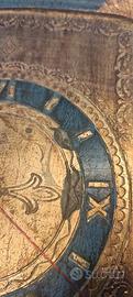 Vassoio Brocantage Fiorentino vintage in legno trasformato in orologio da parete, dipinto con Oro Zecchino Anno: 1975-1980 Acquisizione: 10-02-2026 Provenienza: famiglia privata di Albino e dintorn Stato conservativo: molto buono Funzionamento: decorativo e funzionante Descrizione: in perfetto stile shabby chic , questo è un vassoio risalenti agli anni '80 decorato con oro zecchino , ingranaggio automatico a batteria EL 938 spesso identificato come Junghans 938 in Germania Ovest . Dimensioni 39 X 24 , ricarica orologio a Batteria AA. Difetti : è un vassoietto di legno Shabby Chich, non ha difetti evidenti, invecchiato ad hoc.