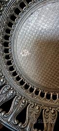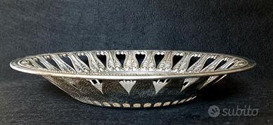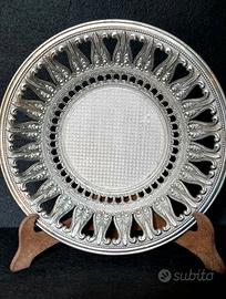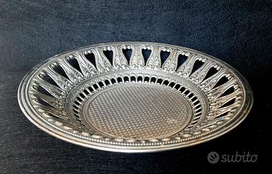 Vassoio/centrotavola in metallo vintage - design brevettato,Italia '50-'70 Vassoio o fruttiera in metallo decorativo con un caratteristico motivo a rilievo. Metallo italiano, seconda metà del XX secolo. Questa fruttiera è come un pezzetto d'Italia. Il traforo merita un'attenzione particolare: è lì che inizia la poesia. Il bordo è sottile, intagliato, con un motivo ripetuto. Ricorda i pizzi antichi, i balconi dei palazzi antichi, le grate in ghisa di Firenze e Napoli, o l'ombra del sole sulle facciate in pietra. Non è solo un bordo; è come una cornice o un centrino di pizzo trasformati in metallo. Il bordo traforato è autenticamente italiano. Il metallo presenta una delicata lucentezza e il tempo ha lasciato delle calde tonalità sulla superficie, conferendo al pezzo un aspetto realistico e autentico. Osservando attentamente, si può notare uno strato sottostante rossastro lungo il bordo del piatto, mentre al centro, al contrario, sono presenti aree con una tonalità argentata più chiara. Questo NON è un difetto, bensì una splendida patina vintage, un segno classico della placcatura in argento su una base metallica. Il vassoio non è stato lucidato a specchio per preservare la nobile patina e la profondità del motivo. Questo crea un effetto di tempo, profondità e autentico aspetto vintage. Sul retro è marchiato "BREV." (brevetto / design brevettato)ITALY".Cioè brevettato, il modello o il disegno è registrato per produzione artigianale/decorativa e indica la produzione decorativa italiana della seconda metà del XX secolo (tipica per l'Italia 1950-1970). Stile: Vintage / Industriale / Wabi-sabi. Si adatta perfettamente ad interni boho, vintage, mediterranei, eclettici e moderni. Perfetto per: vassoi per frutta, dolci e gioielli, o come elemento decorativo indipendente su un tavolo o una cassettiera. 📏590 g, diametro - 28 cm, altezza - 4,5 cm Il piatto viene venduto senza supporto