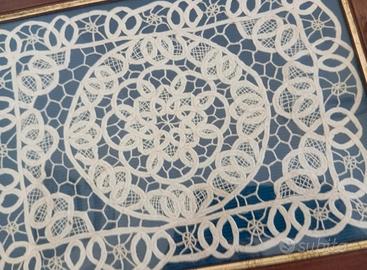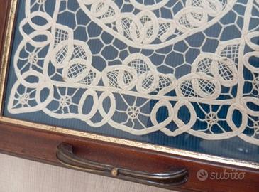 vassoio di legno con manici che contiene un centrino antico o vintage, probabilmente realizzato a mano con la tecnica del pizzo tombolo.