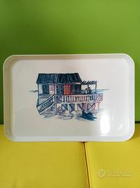 Vassoio in resina bianca decorato con una casetta sulla spiaggia.