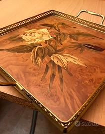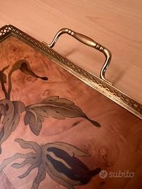 Vassoio da caffè usato vintage in legno intarsiato con manici r bordi in metallo. Misure 26 x 26 cm. Buono stato