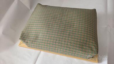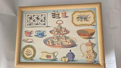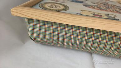 Vassoio da letto con cuscino caratterizzato da una cornice in legno naturale e un'illustrazione vintage a tema servizio da tè sulla superficie superiore. Sotto la cornice in legno è presente un cuscino morbido rivestito con un tessuto a trama scozzese (tartan) multicolore. Questa base imbottita permette al vassoio di adattarsi alle gambe dell'utilizzatore, offrendo stabilità per leggere, mangiare o usare un computer portatile. Misure 45×33 cm circa.