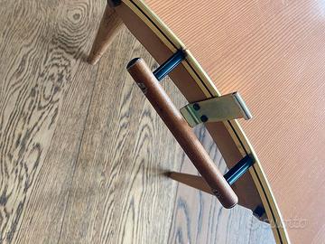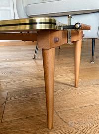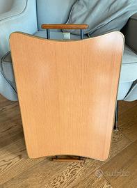 Vassoio pieghevole per la colazione vintage. Manici e gambe a scomparsa in legno, profilo in ottone e piano in formica. Larghezza totale 64,5cm, profondità 40cm, altezza (aperto) 27cm, spessore chiuso 6cm.