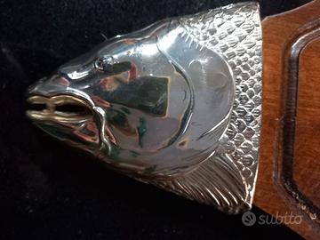 Vassoio da portata per salmone, dimensioni cm. 58x17,5x2. Dimensioni utili cm. 34x17,5. Testa e coda in metallo forgiato argento, corpo in legno teak non assorbente facilmente lavabile. Per ritiro a mano Roma zona Colli Portuensi.