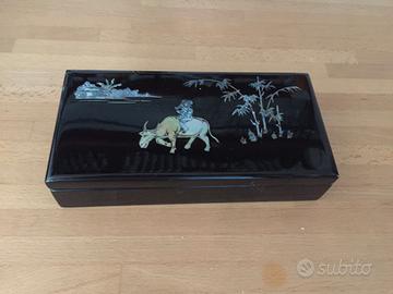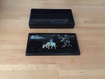 Vassoio laccato nero lucido originale con inserti in madre perla (45 cm x 29 cm x h4cm) + scatola porta tè, spezie, gioie etc. con coperchio abbinata.