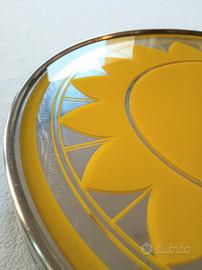 Vassoio rotondo vintage con base in metallo cromato e piano superiore in vetro specchiato con il disegno di un grande fiore giallo stilizzato o di un sole. Anni '60-'70 (Space Age). E' girevole ed è divertente usarlo a tavola anche perché non è ingombrante.
