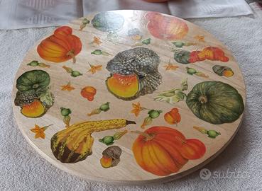 bellissimo vassoio in legno con base girevole, decorato con una simpatica fantasia di zucche, 40 cm diametro e 3,5 altezza, base diametro 20. Usato pochissimo