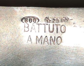 Pregiatissimo vassoio con funzioni anche di vuota-tasche in argento battuto a mano totalmente in argento titolo 800 molto fine e di qualità. Peso circa 105 grammi