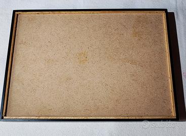Bellissimo vassoio rettangolare in legno con manici laterali. Il vassoio presenta una stampa raffigurante una scena con vaso e cucchiai.