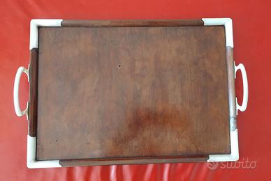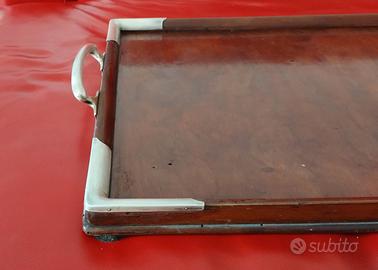 Vendesi pregiato vassoio in noce con inserti e manici in argento 800 in buone condizioni. inoltre incluso ripiano in vetro interno e centrino. Misure 52x37 cm.