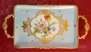 Vassoio decorativo in porcellana fine, perfetto per chi ama l’eleganza classica e lo stile barocco. Realizzato con cura, presenta finiture dorate sui bordi e sui manici, che aggiungono un tocco di lusso. Le dimensioni (circa 30x25 cm) lo rendono ideale per servire dolci, frutta o come elemento decorativo.