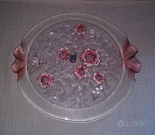 Vassoio in vetro decorato con fiori rosa.