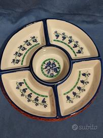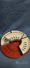 Vassoio di vimini con una composizione di 5 contenitori di ceramica spessa per le salse.