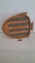 L'oggetto mostrato nell'immagine è un vassoio vintage a forma di pesce realizzato in bambù e rattan intrecciati. Anni 60"