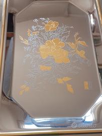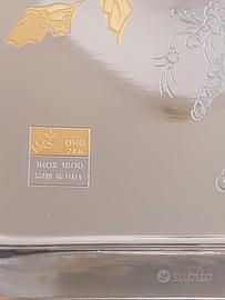 Mi è stato regalato tanto tempo fa ma non lo ho mai usato, sempre tenuto incartato. Misura 24x36 cm. E' in acciaio inox con un disegno floreale. Come da foto, alcune parti sono in oro (così è scritto).