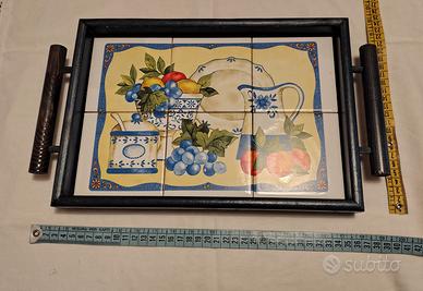 Vassoio legno e piastrelle in ceramica decorate. Dimensioni 40x24 cm. circa. Condizioni come da foto allegate.