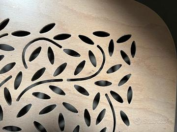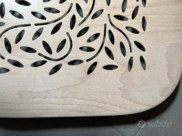 Vassoio in legno decorato a traforo, realizzato in faggio curvato. Quando il vassoio non viene usato può essere appeso al muro con funzione decorativa.la tecnica e quella utilizzata per la produzione di strumenti musicali a percussione
