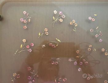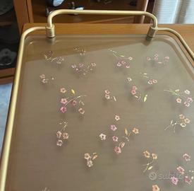 Vassoio con manici in ferro battuto color bronzo, ripiano vassoio in vetro con decorazioni dipinte a mano (fiorellini) Peso: 2kg 300g Nuovo mai usato