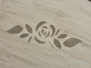 Presenta una finitura tipica di questo stile nei toni bianco antico e grigio tortora, con decoro floreale centrale a stencil