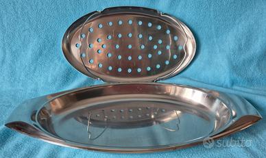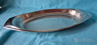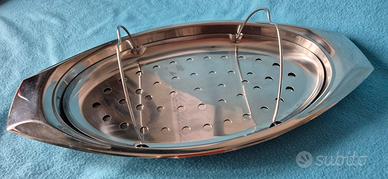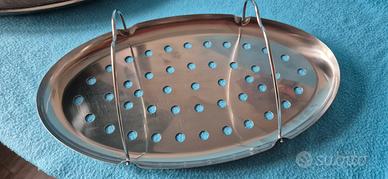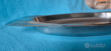 Vendo per 30 euro piatto di portata AMC ovale in acciaio con cestello. Dimensioni vassoio: cm 44 x 23, altezza cm 3,5. Dimensioni cestello cm 33 x 19,5.